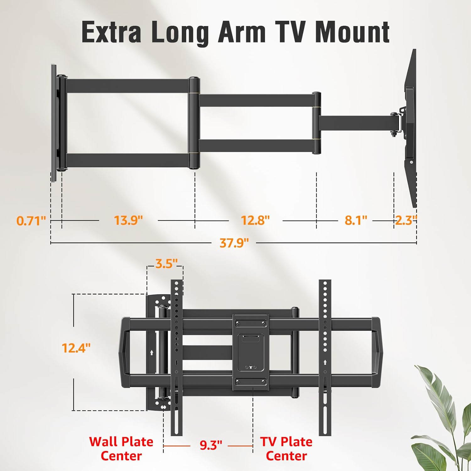 - 37.9" Extra Long Extension Arm: Long extension TV mount extends 37.9" from wall to cover more viewing positions, and retract 3" to wall to save space for a clean look. The long extend and swivel function allows to watch TV wherever you're seated