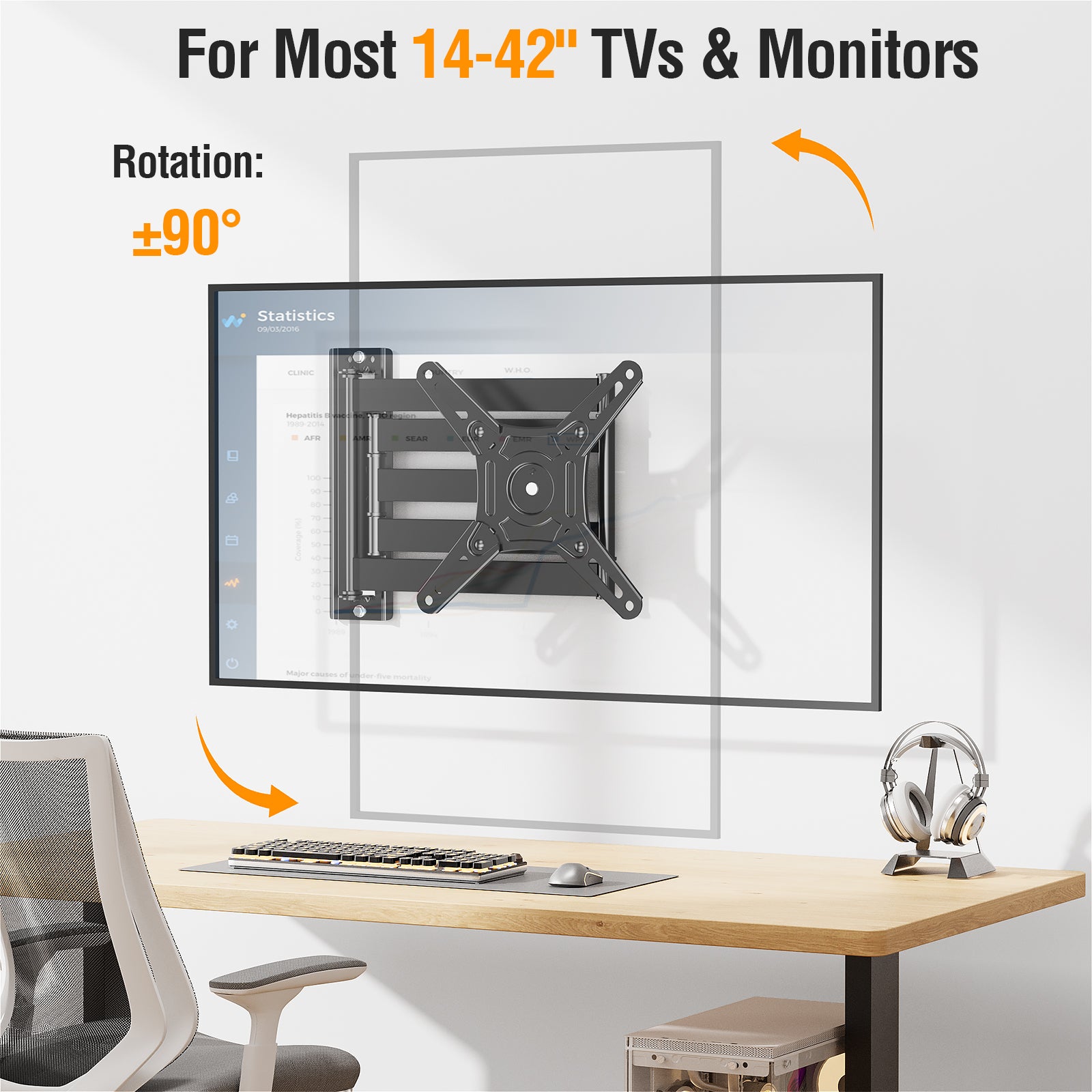 - ±90° Rotation & Swivel Design - With the ±90° rotation unique design, the full motion TV mount can easily display in landscape or portrait position to meet your special need. Also, this swivel TV mount can swivel TV ±90° to cover any angles in your home for the ultimate viewing experience.