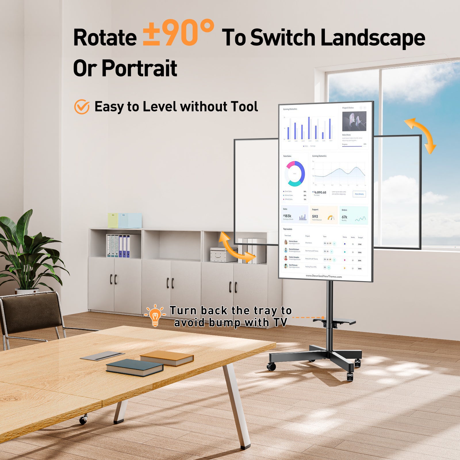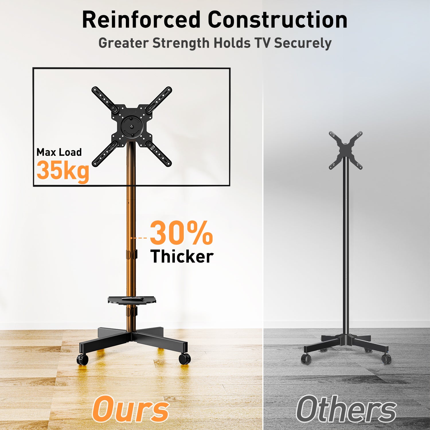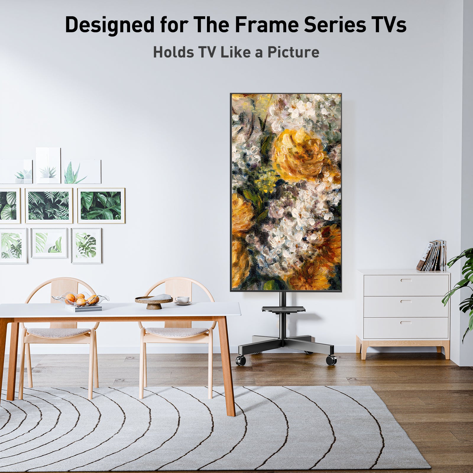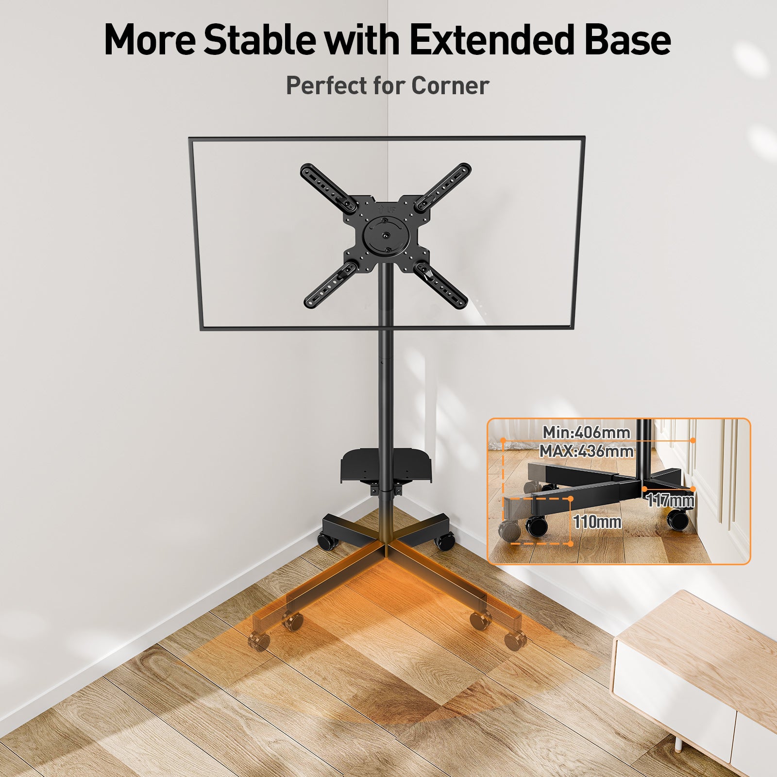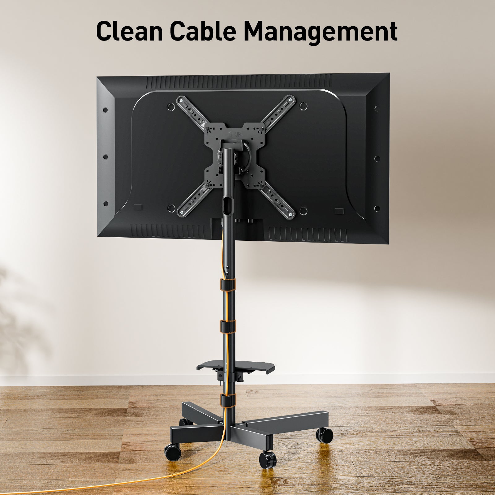 - Locking Wheels & Space-Saving Design: Four heavy-duty 360° movable casters with brakes ensure smooth mobility and secure positioning. Low-profile rear feet keep the stand close to the wall, perfect for corners or tight spaces while maximizing room layout efficiency.