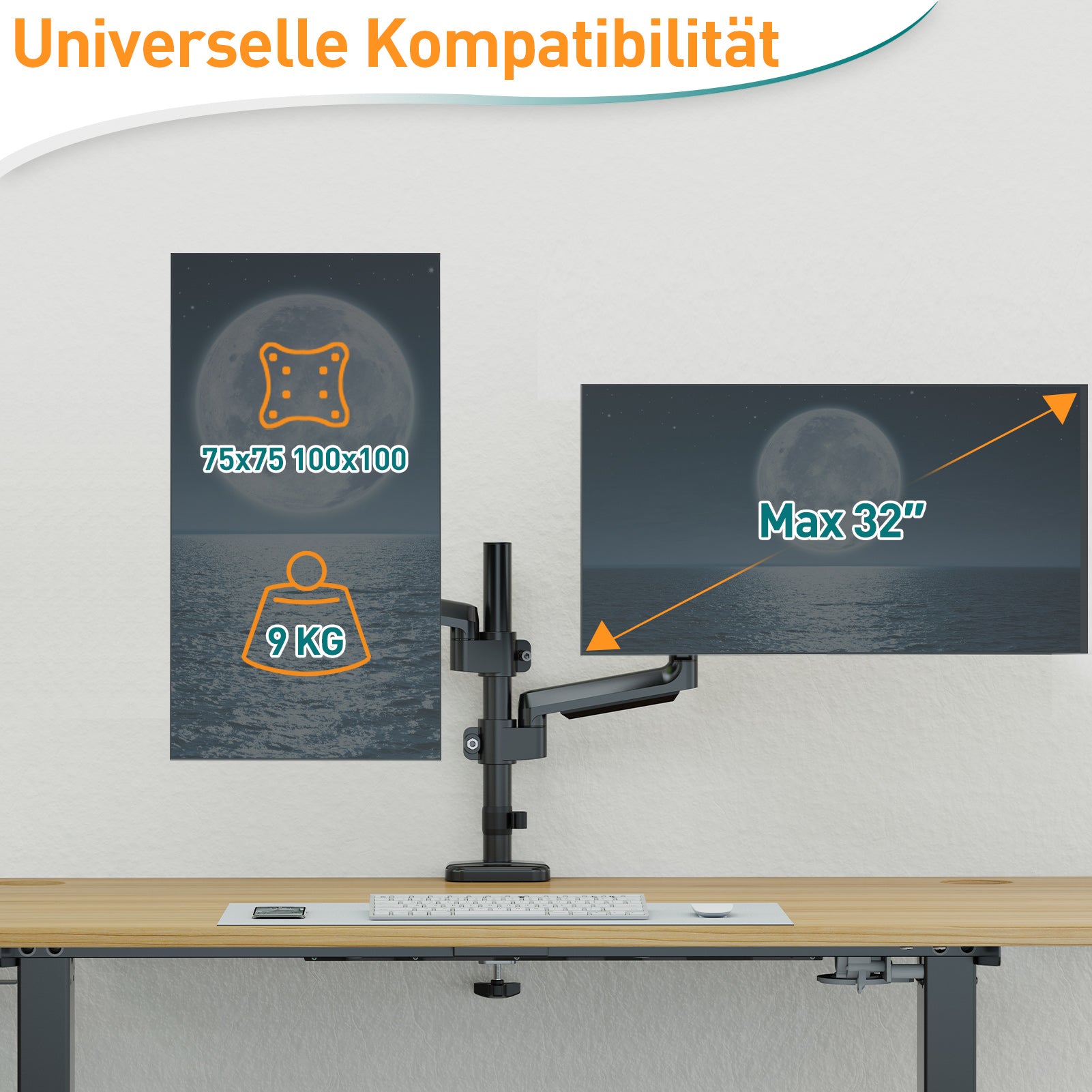 - Breite Kompatibilität - Unsere Dual-Monitorhalterung ist für die meisten Computerbildschirme von 13, 19, 21,5, 22, 23, 24, 27, 32 Zoll geeignet und trägt 2-9 kg pro Arm. Es verfügt über VESA 75x75mm oder 100x100mm Befestigungslöcher und kann leicht an Schreibtischen (bis zu 85thick) mit einer schweren C-Klammer oder optionalen Tüllenhalterung montiert werden.