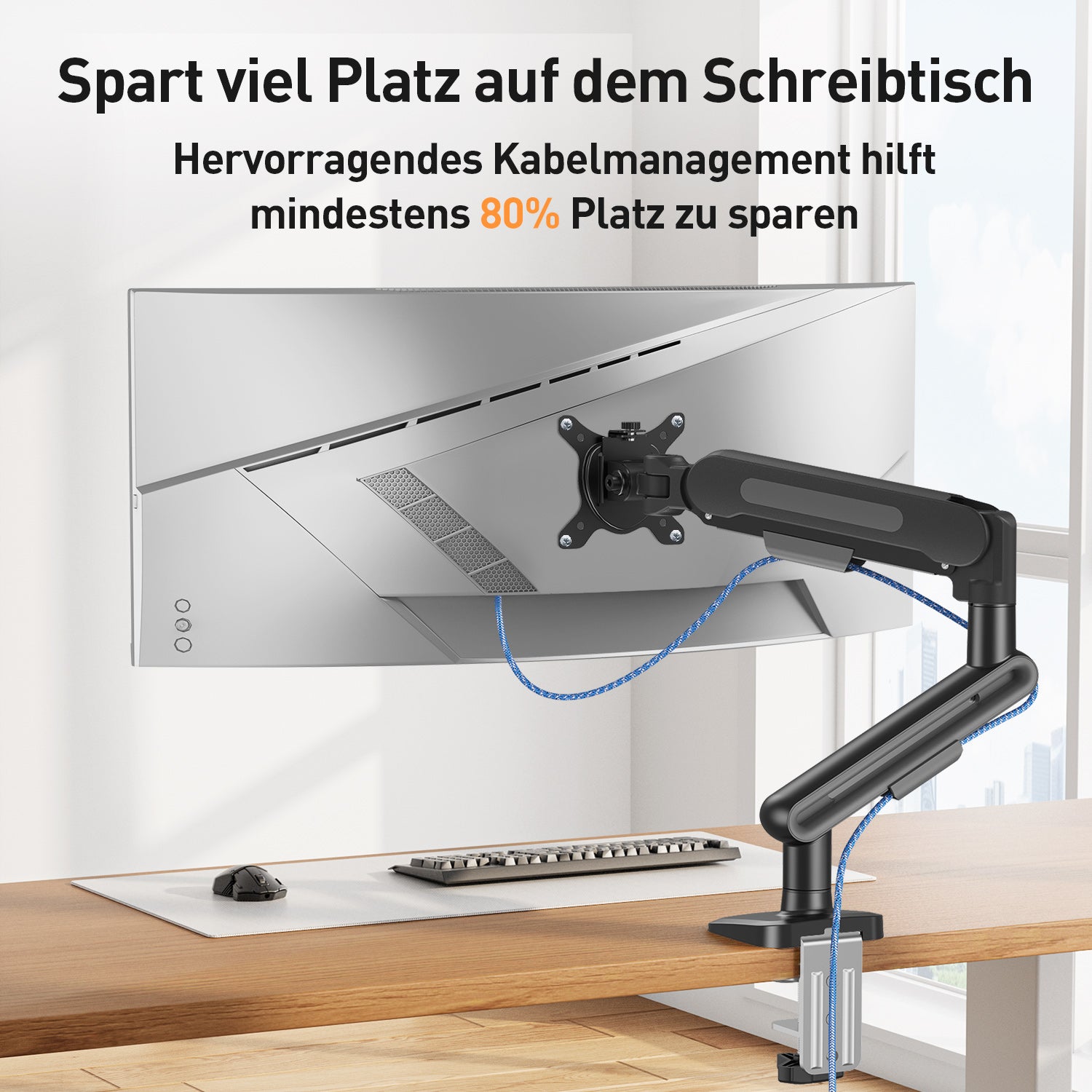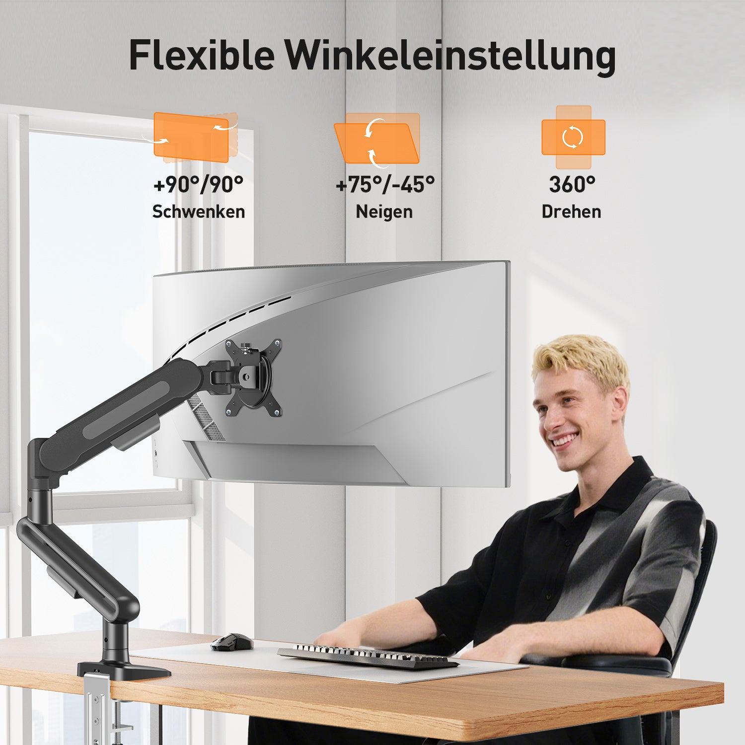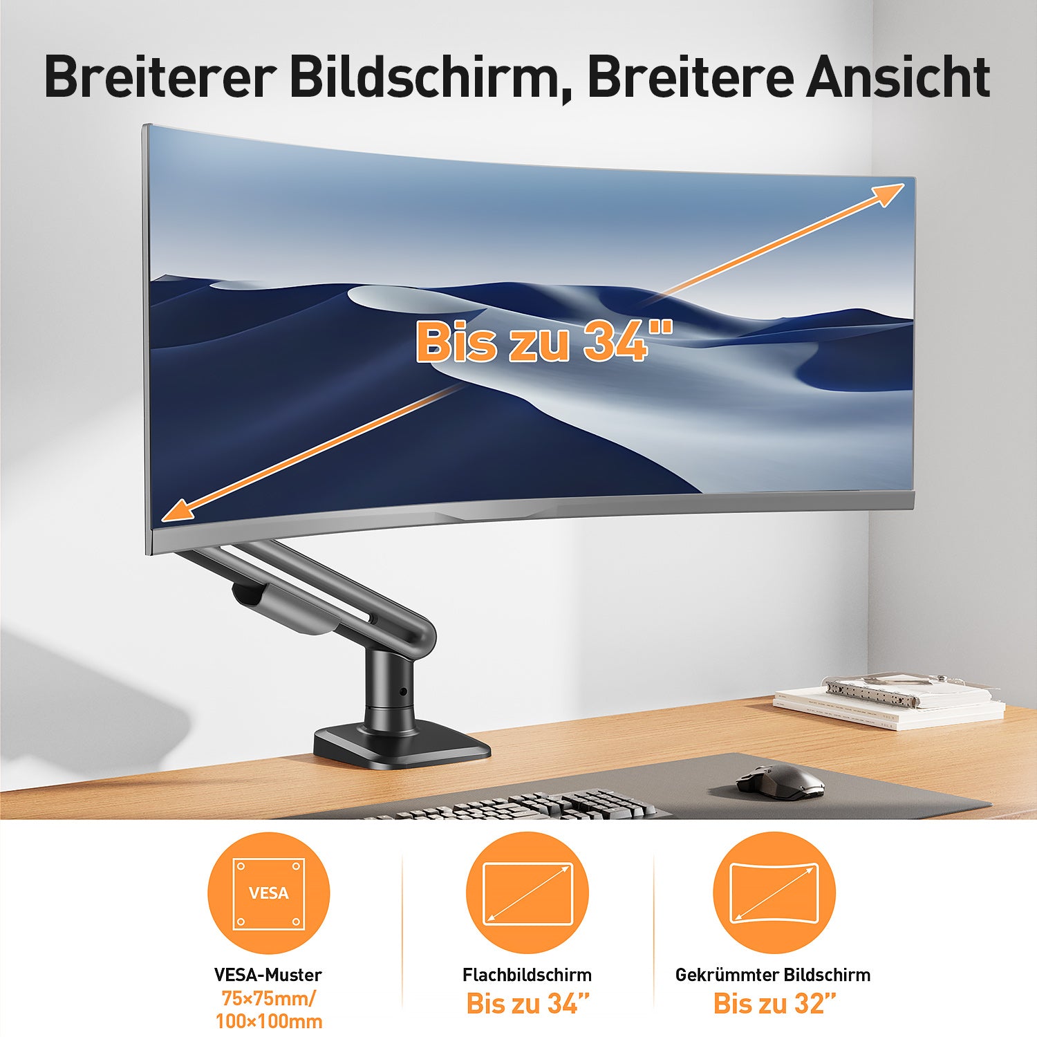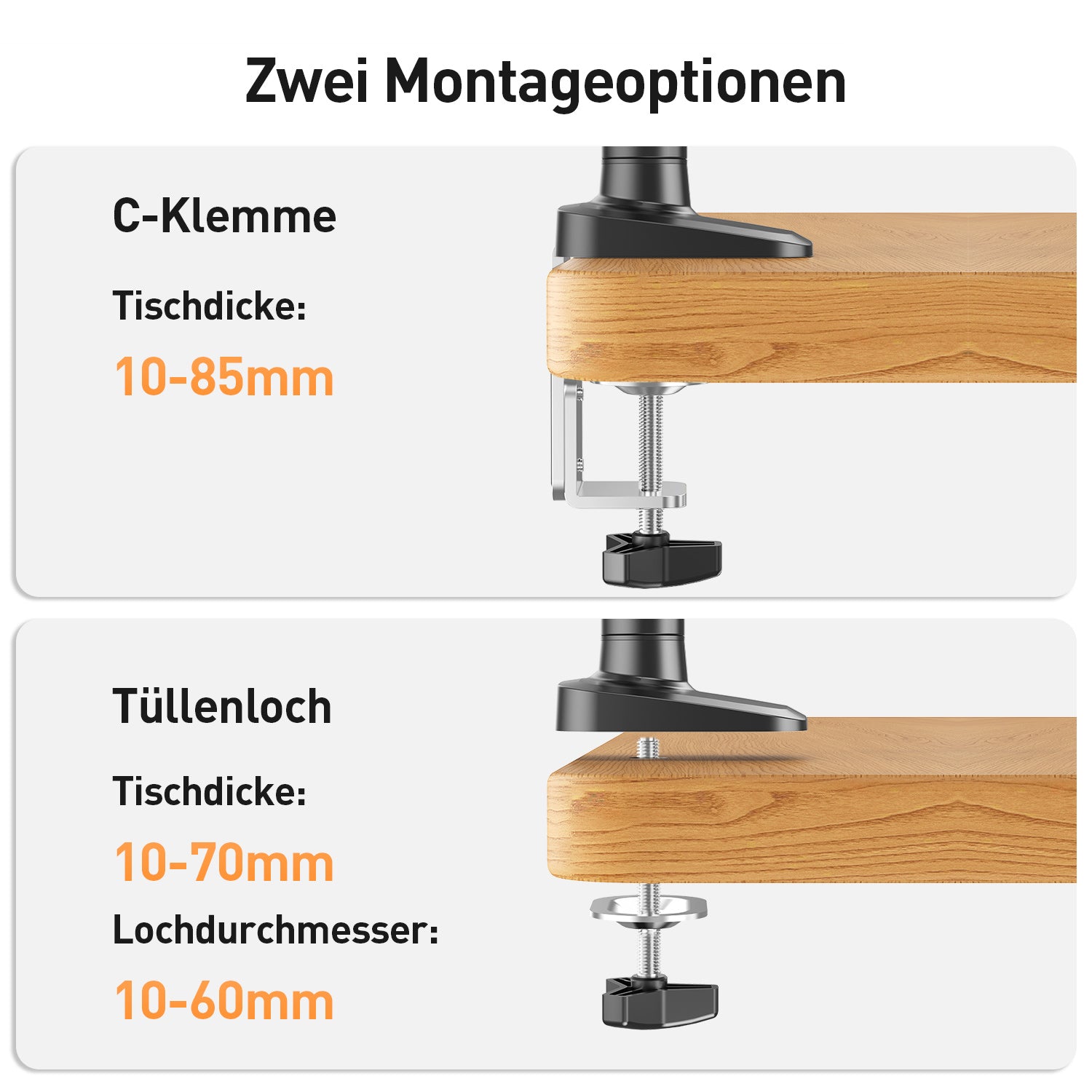 - Robuste Stabilität - Sicherer Halt für bis zu 12kg schwere Ultrawide- und Gaming-Monitore (34 Zoll). Die stabile C-Klemme (10-85mm Tischdicke) und Durchbohrungsoption (10-70mm, Ø10-60mm) garantieren perfekten Halt auch auf besonders dicken Schreibtischplatten, Arbeitsstationen und Gaming-Tischen.