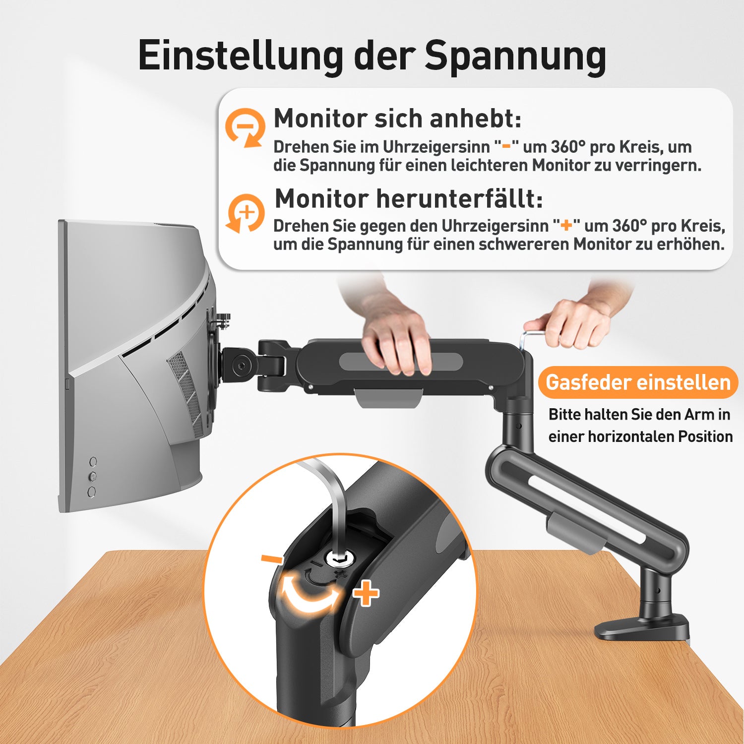 Einfache Installation - Kommt mit klaren Anleitungen und allen benötigten Montageteilen. Tipp: Vor der Montage den Monitor aufhängen und die Gasfeder-Spannung optimal einstellen. Bei Fragen zögern Sie bitte nicht, uns zu kontaktieren.