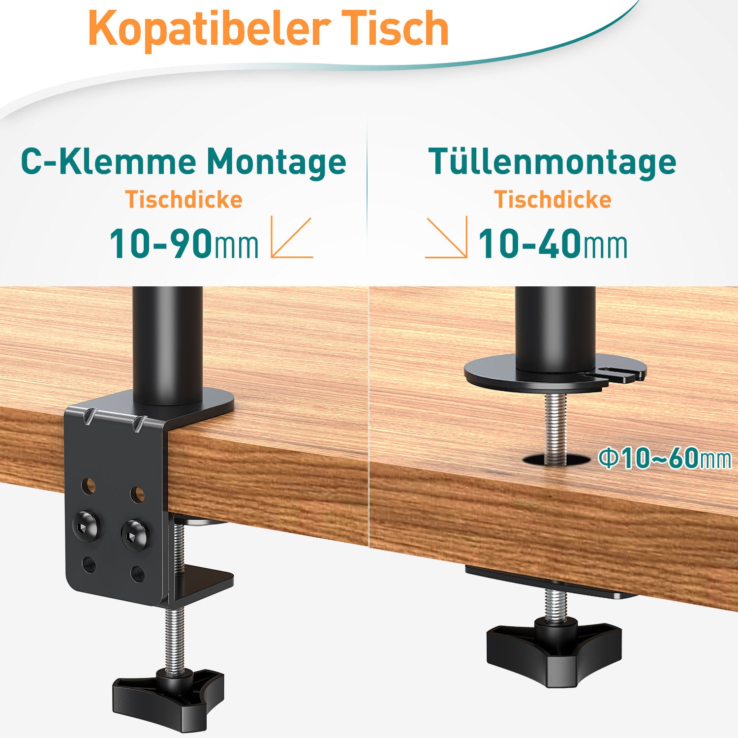 - 2 mounting options – This dual monitor mount comes with C clamp and grommet base, you can choose the mounting method for your desk. Option A: C-clamp (for table thickness 10-50mm). Option B: grommet base (for table thickness 10-50mm, hole diameter 10-60mm).