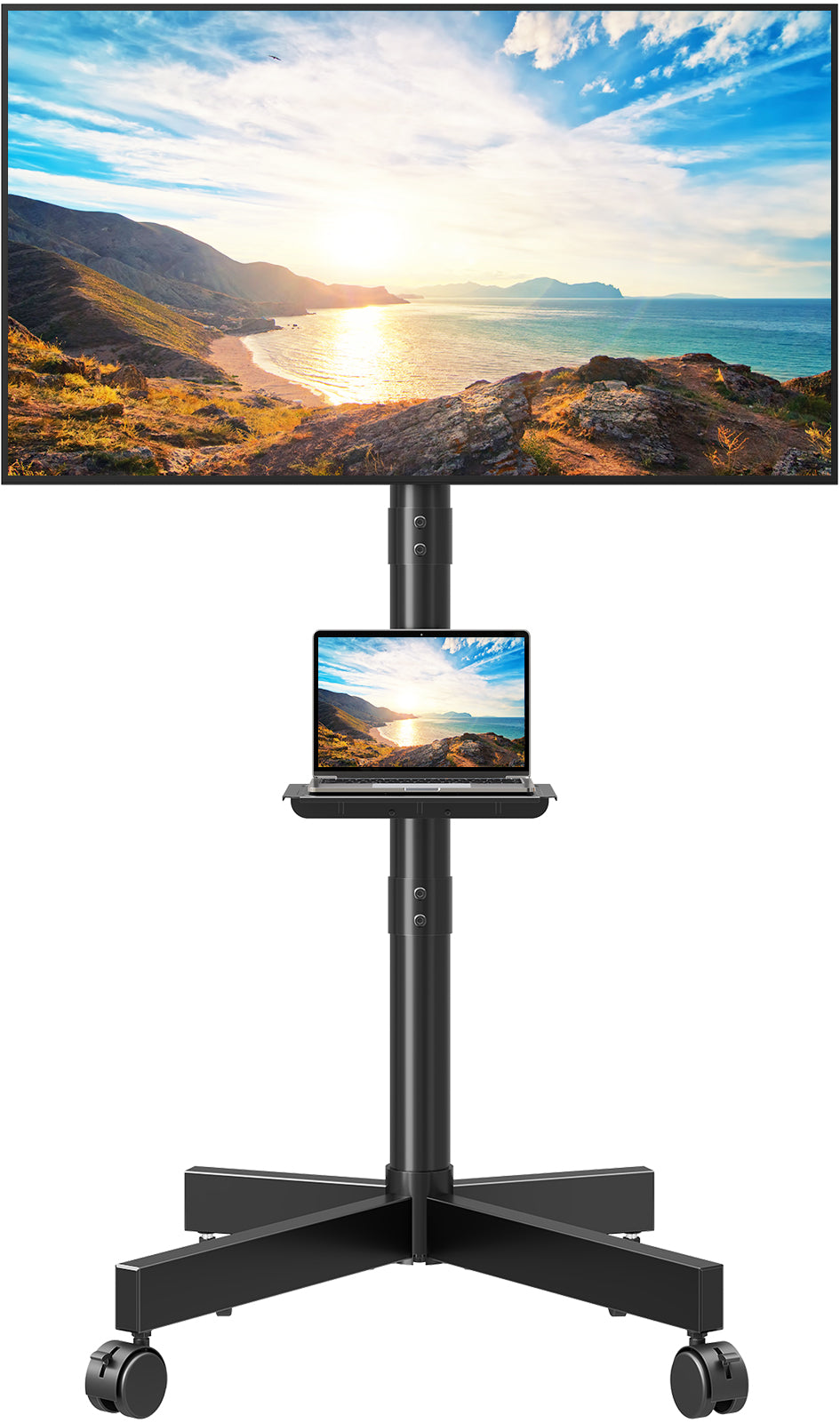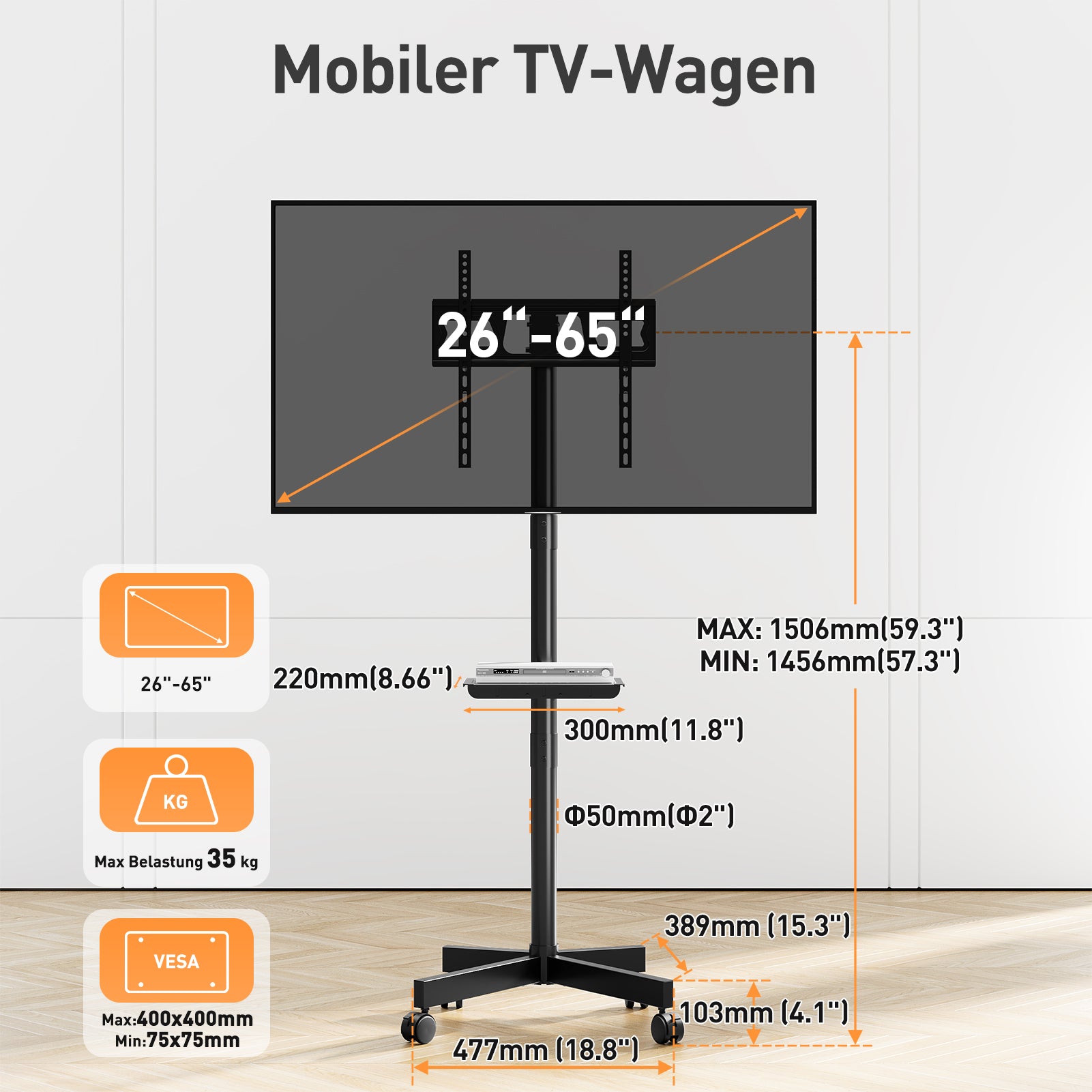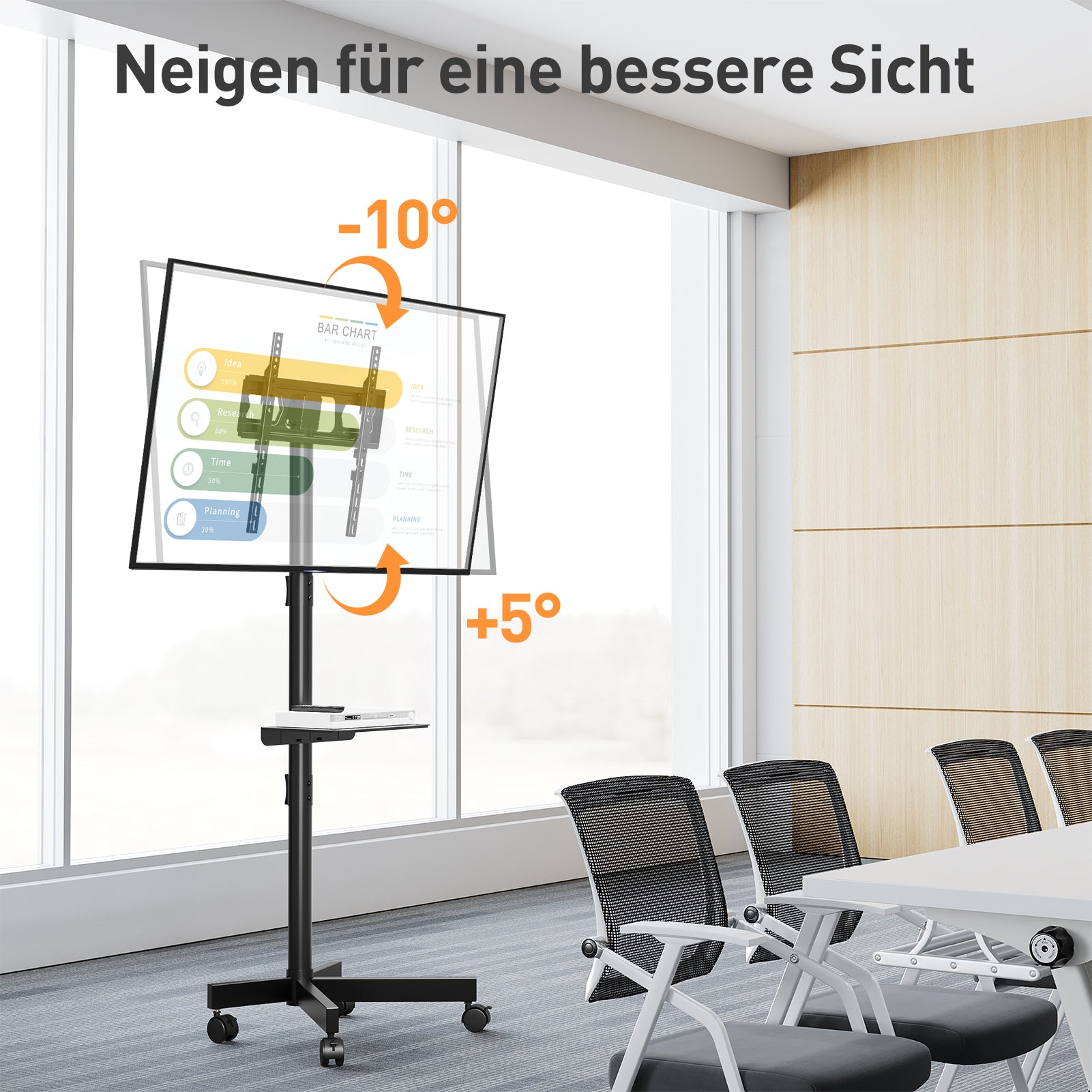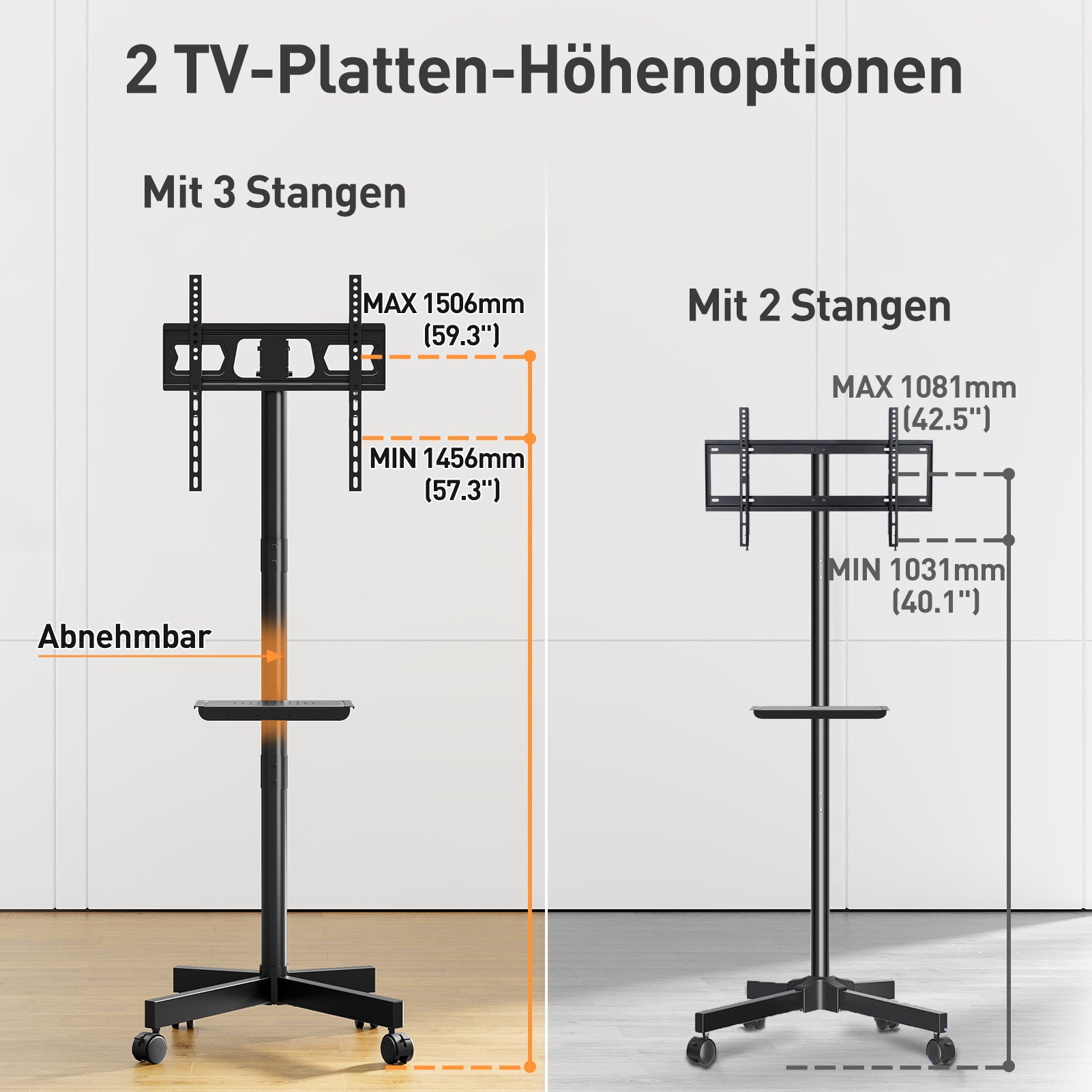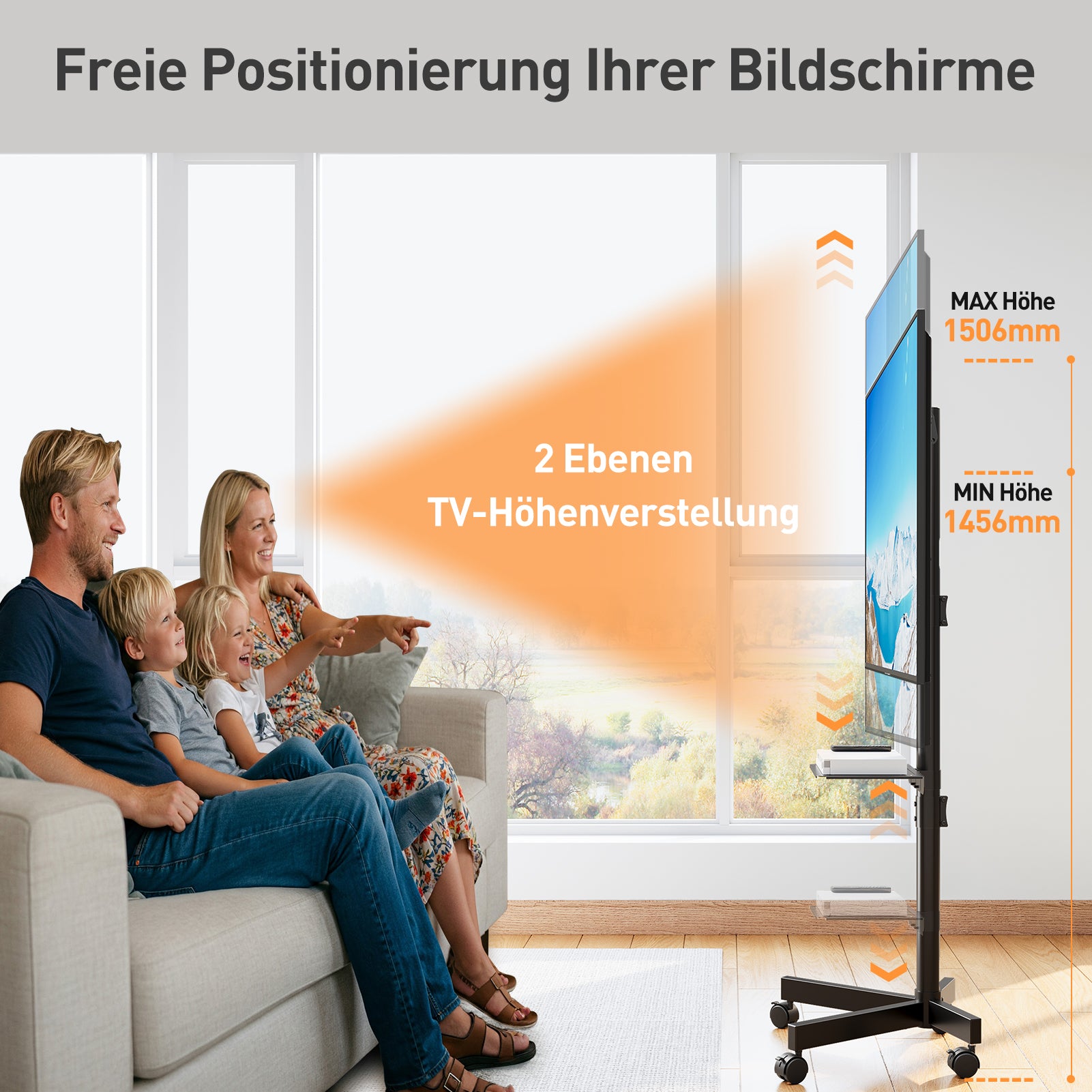 - Höhe & Neigung Anpassbar - Der TV Standfuss bietet Höhenverstellung (1456-1506 mm) und Neigungswinkel (+5° bis -10°) für perfekten Blickwinkel. Und mit diesem rollbaren TV-Ständer mit Medienablage können Sie Ihren Fernseher mit einer Medienbox, einem Laptop oder einem Spielgerät verschieben, um von überall aus eine perfekte Sicht zu haben. Perfekt als TV Wagen für Wohnzimmer, Büro, Fitnessstudio, Hotel oder Outdoor.