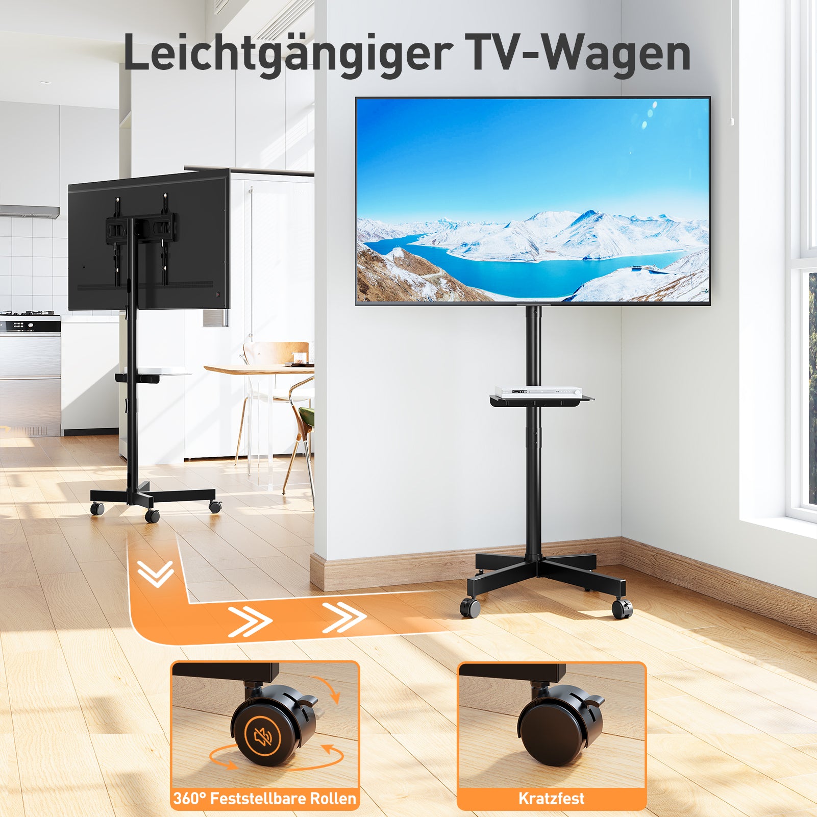 - Reibungslose Mobilität - 4 leichtgängige und feststellbare Rollen bewegen Ihren Fernseher mühelos! Mit den beweglichen Rädern des Fernseher Ständers können Sie den Fernseher mühelos von einem Raum zum anderen bewegen, und die Räder des rollenden TV-Wagens lassen sich leicht feststellen, um die Sicherheit zu gewährleisten. Natürlich machen die Räder des mobilen TV-Ständers aus hochwertigen Materialien keine lauten Geräusche wie andere Räder.