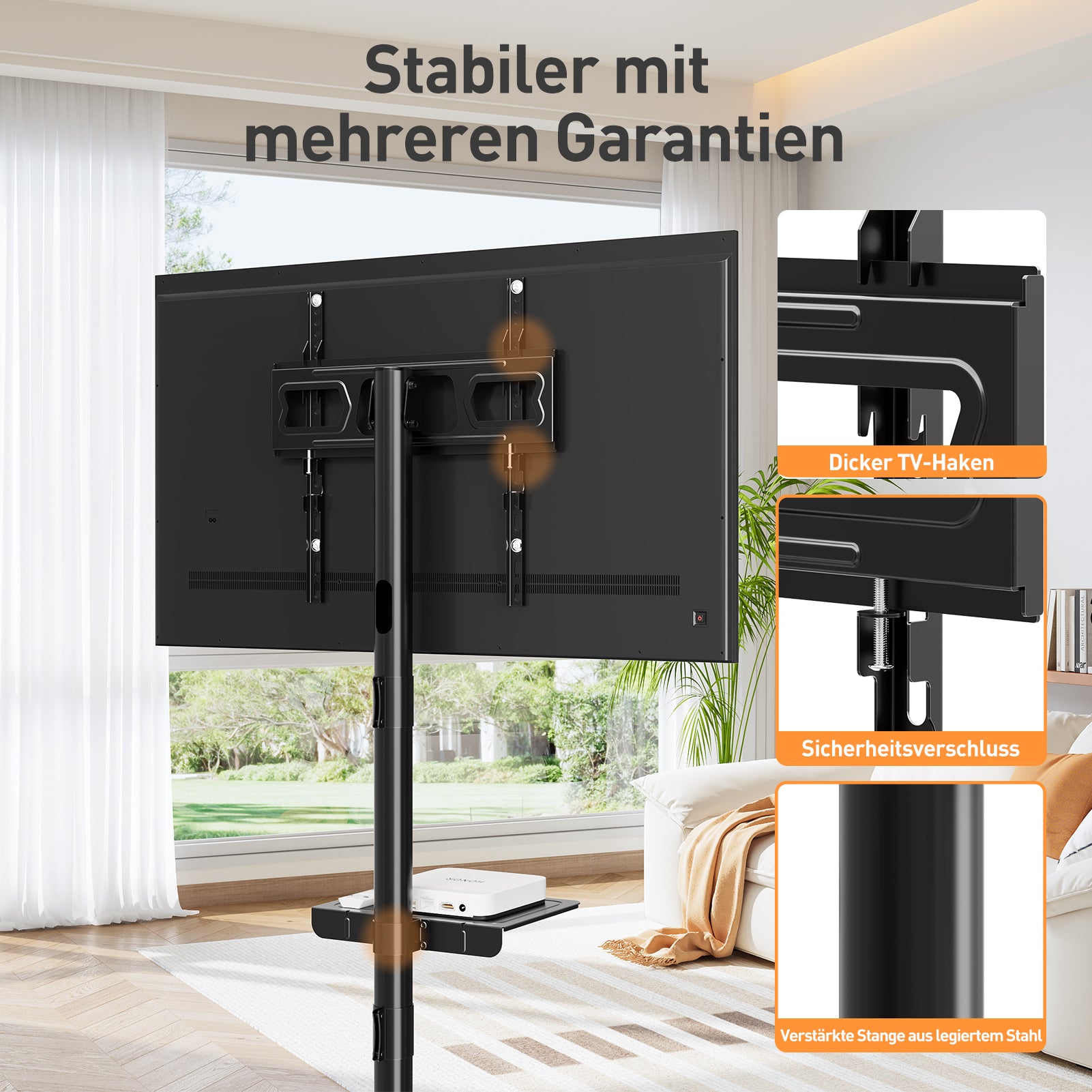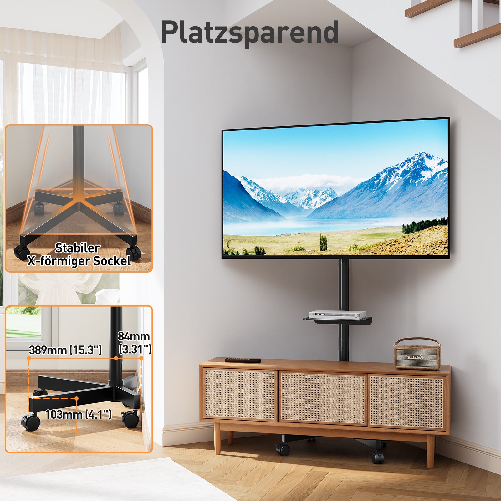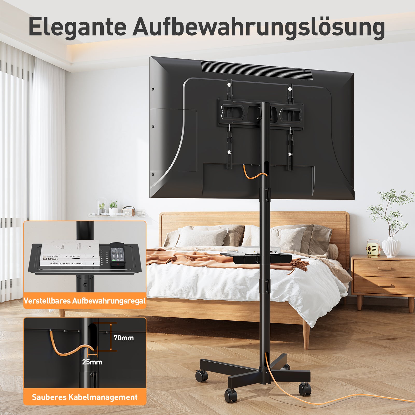 Platzsparend & Einfach - ohne Bohren! Der Bodenständer ist schnell montiert und passt in jeden Raum. Der stabile TV-Ständer mit cleverem Design (vorne lang, hinten kurz) passt nah an die Wand, ideal für kleine Räume. Integriertes Kabelmanagement für Ordnung. Perfekt für Wohnungen & Schlafsäle, fügt sich hinter Möbeln unauffällig ein.