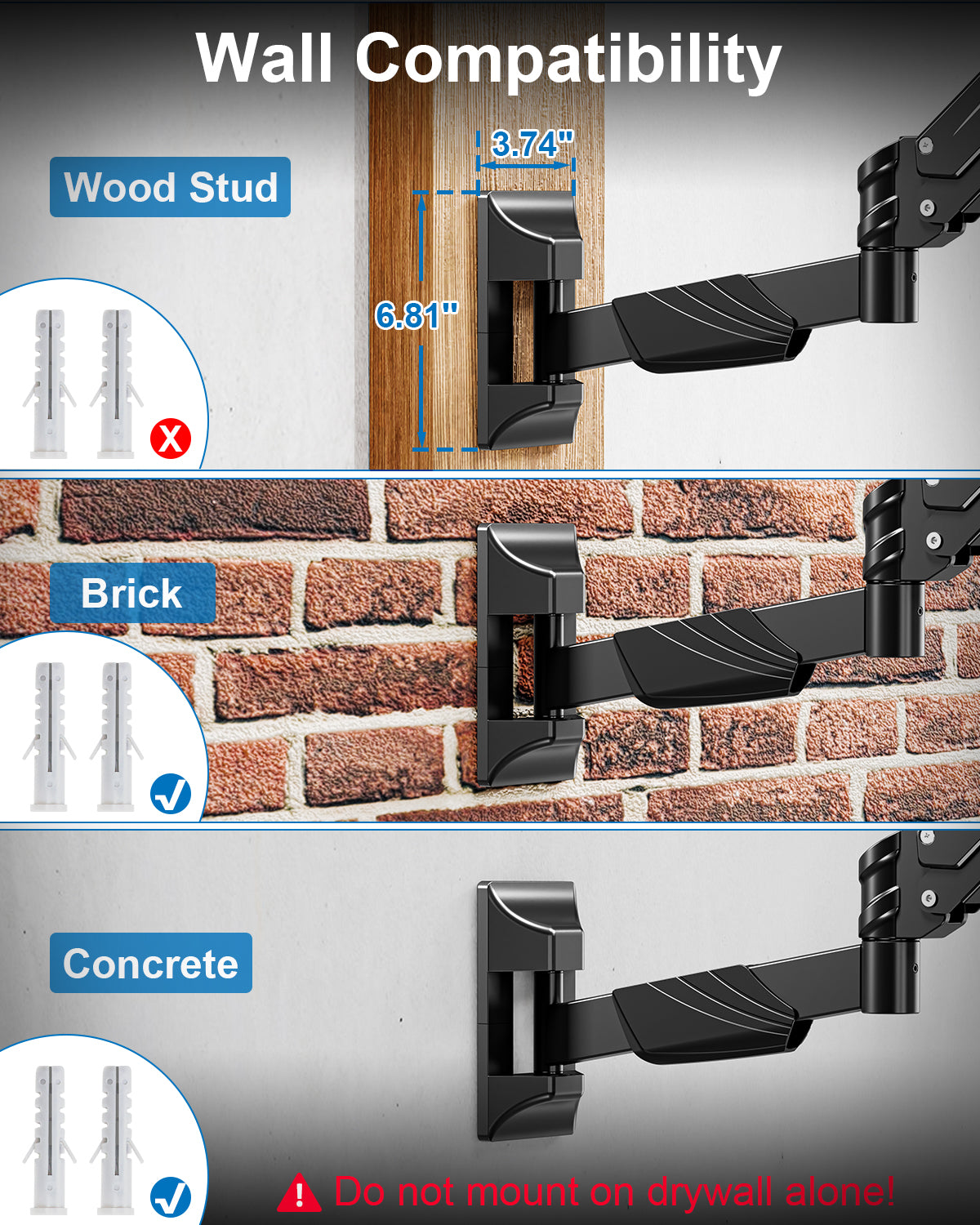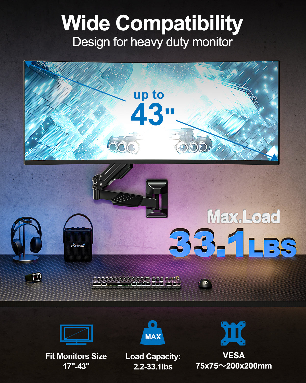 - Outstanding Load Capacity : Designed for heavy-duty computer monitor, this gas spring wall mount single arm can support up to 33.1 lbs and compatible with 17 19 22 23 24 27 30 32 34 35 40 43 inch curved screens/Flat screens. Whether it's a bulky professional display or a large home screen, it provides stable support to prevent wobbling or tilting, ensuring long-term safety.