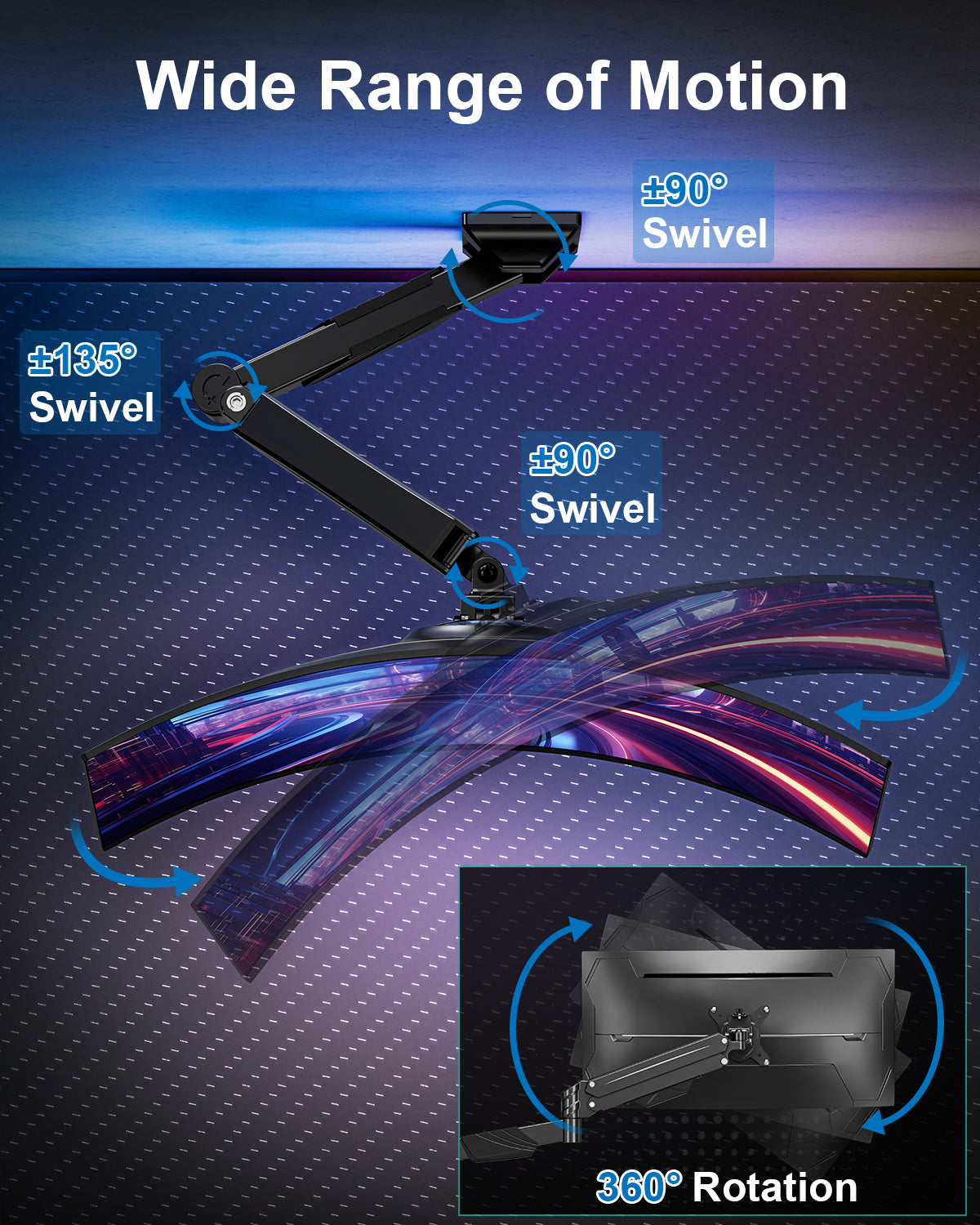 - Ergonomic Design for Customizable Comfort : ErgoFocus single wall mount allows versatile adjustments (tilt -90° to ﹢90°, swivel 180° and rotation 360°) to freely position your monitor at the ideal height and angle. Reduces neck fatigue for prolonged use in office, gaming, or streaming scenarios.