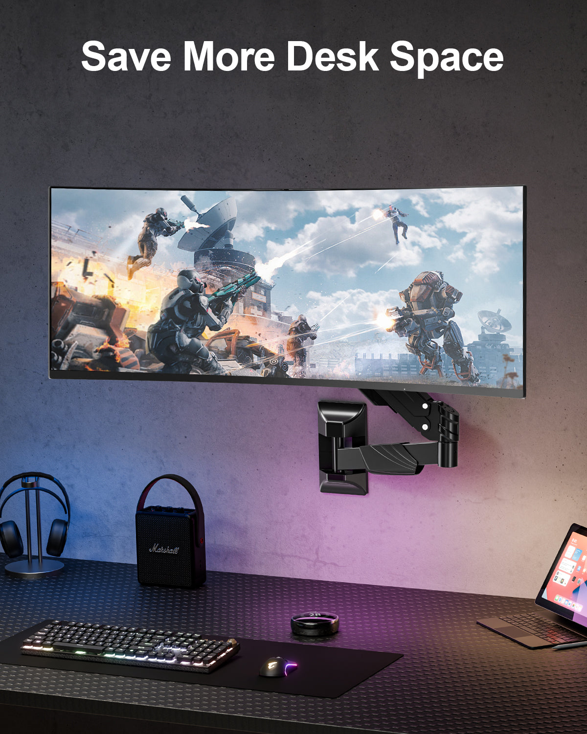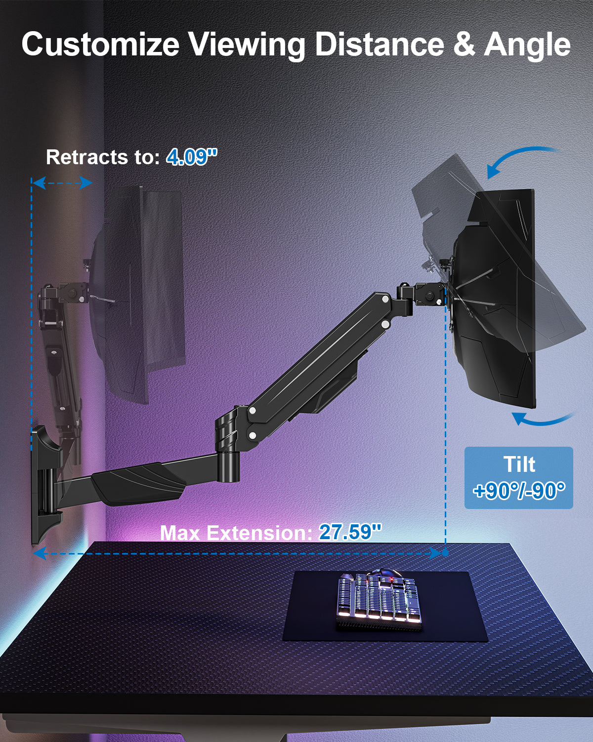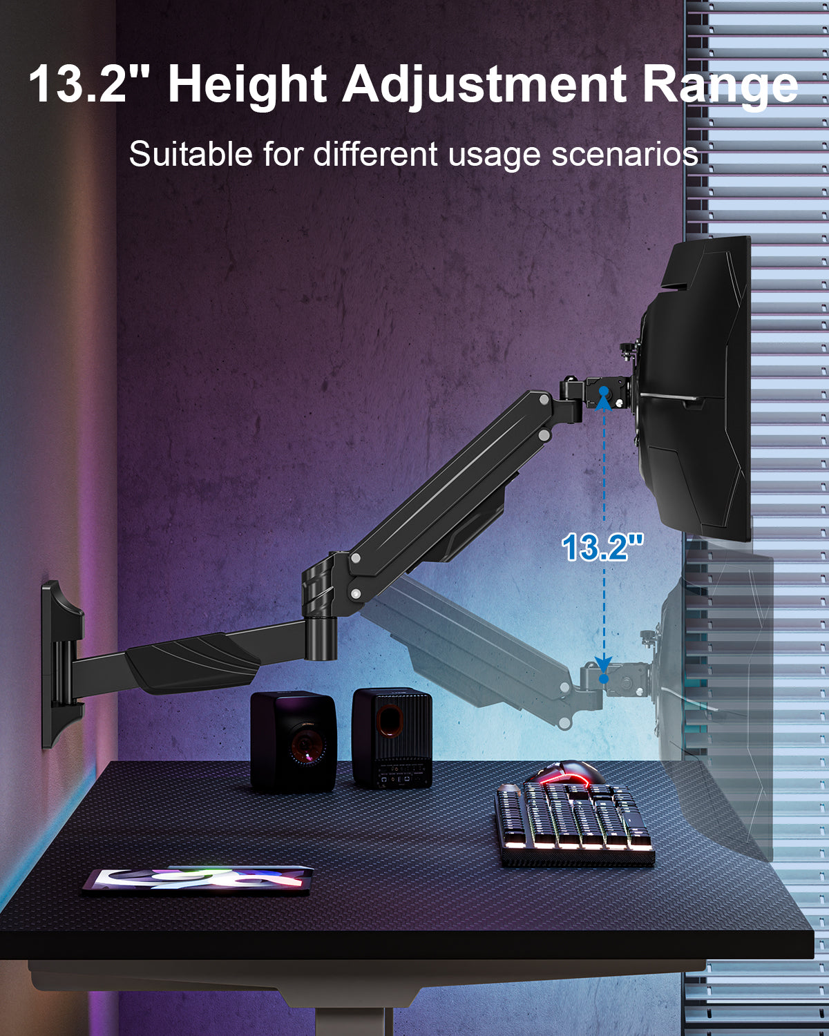 - Clutter-Free Desktop and Cable Management : The single-arm wall mount saves desk space while the integrated cable management system neatly hides wires, avoiding cable clutter. A tidy workspace not only enhances aesthetics but also improves focus and efficiency.