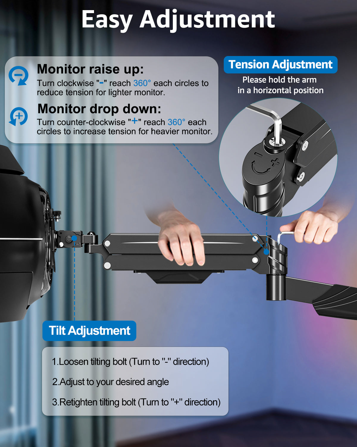 - Effortless and Flexible Installation : This computer monitor wall mount is quick and easy to install with the included hardware and instruction manual. Simply attach it to the wall and adjust to your desired position in minutes.