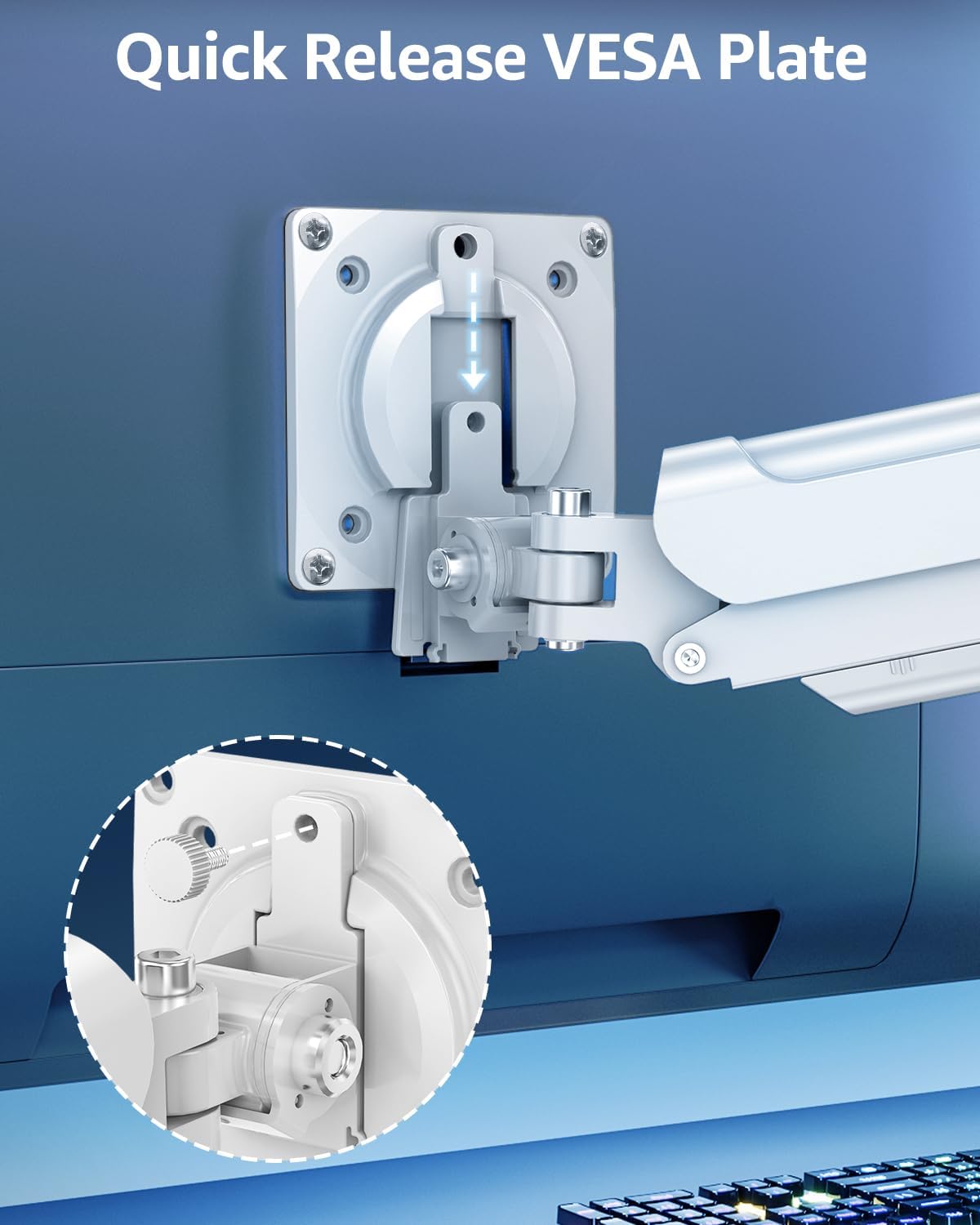 - Quick and Easy Assembly: Featuring a three-stage mounting system, this monitor arm eliminates the risks of gas spring arms, providing a safer setup than traditional one-piece VESA mounts. With detailed instructions, installation takes just 5 minutes. For any issues, our customer support team is ready to assist.