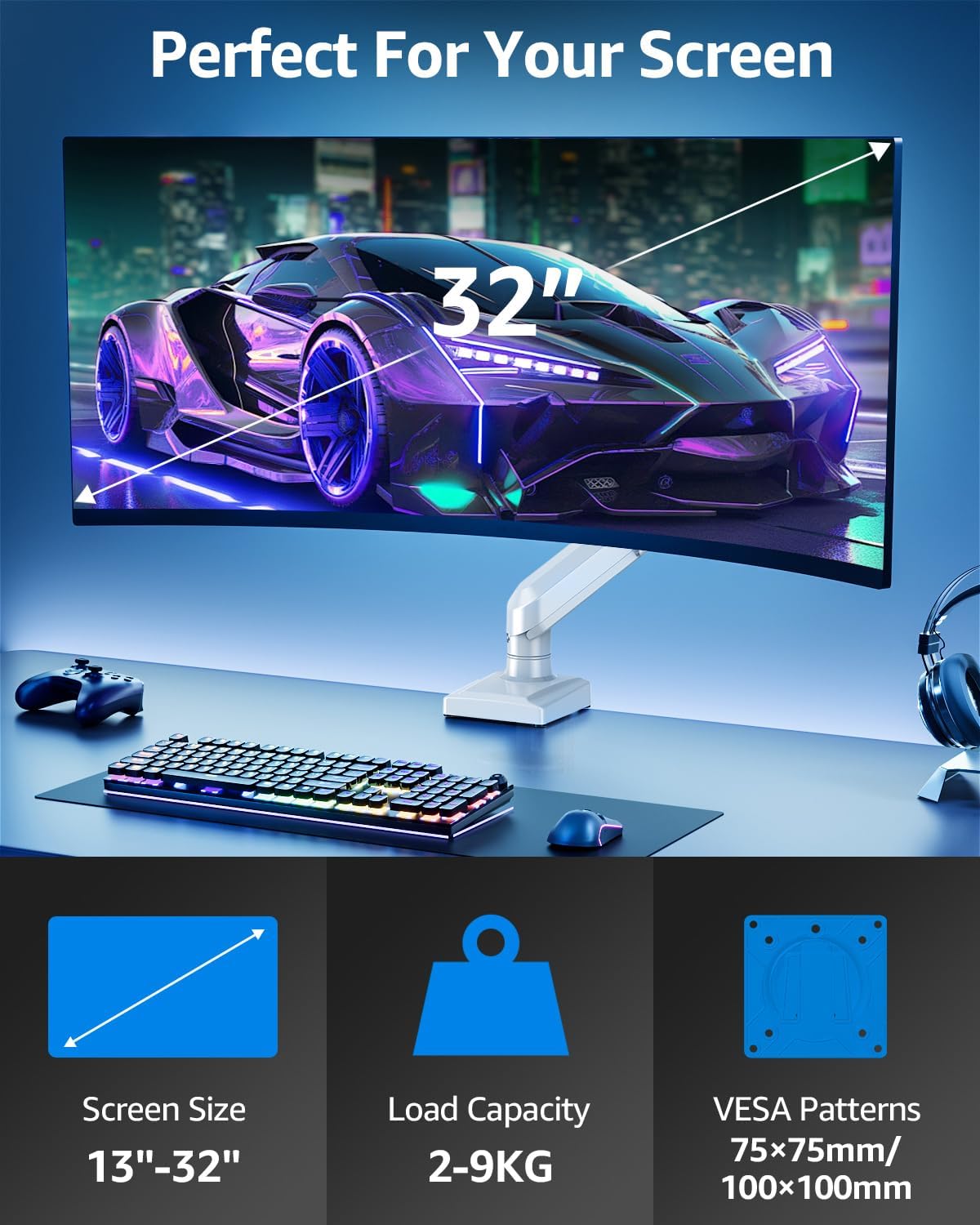 - Sturdier & Safer Design - Made from aluminum alloy, the Freelift Pro gas spring monitor arm is designed to most 13 - 32 inch flat or curved monitors, holding 2-9kg screens. With VESA patterns 75x75mm and 100x100mm, compatible with Samsung, ASUS, Acer, LG, HP, AOC, Dell, Sceptre, etc. You can trust it to hold your expensive equipment safely.