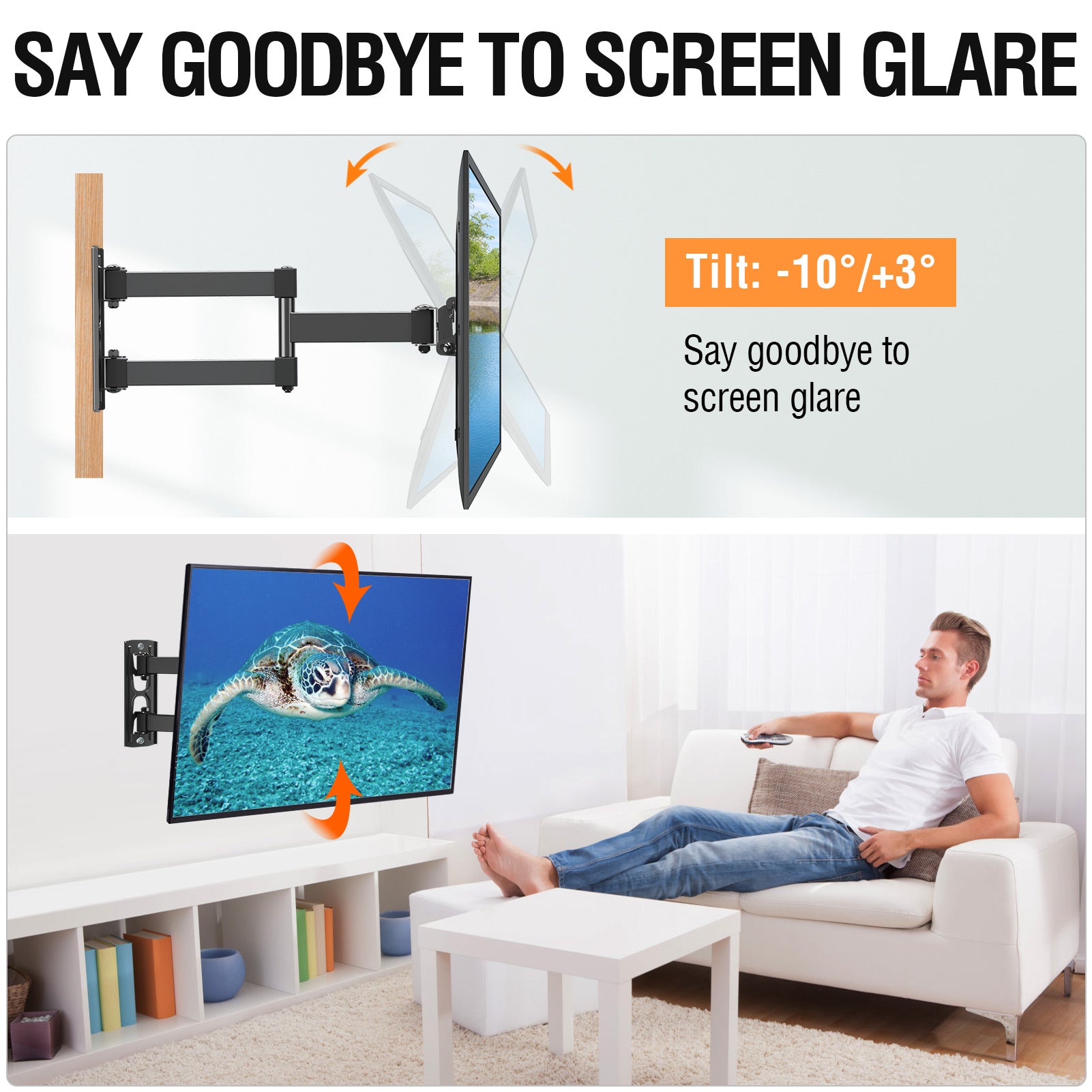 - Adjustable for Max Flexibility - This TV wall mount bracket can tilt TV +3°/-10° to reduce glare. The strong articulating arm provides a smooth 14.96" extension and 2.67" depth to the wall for saving space.