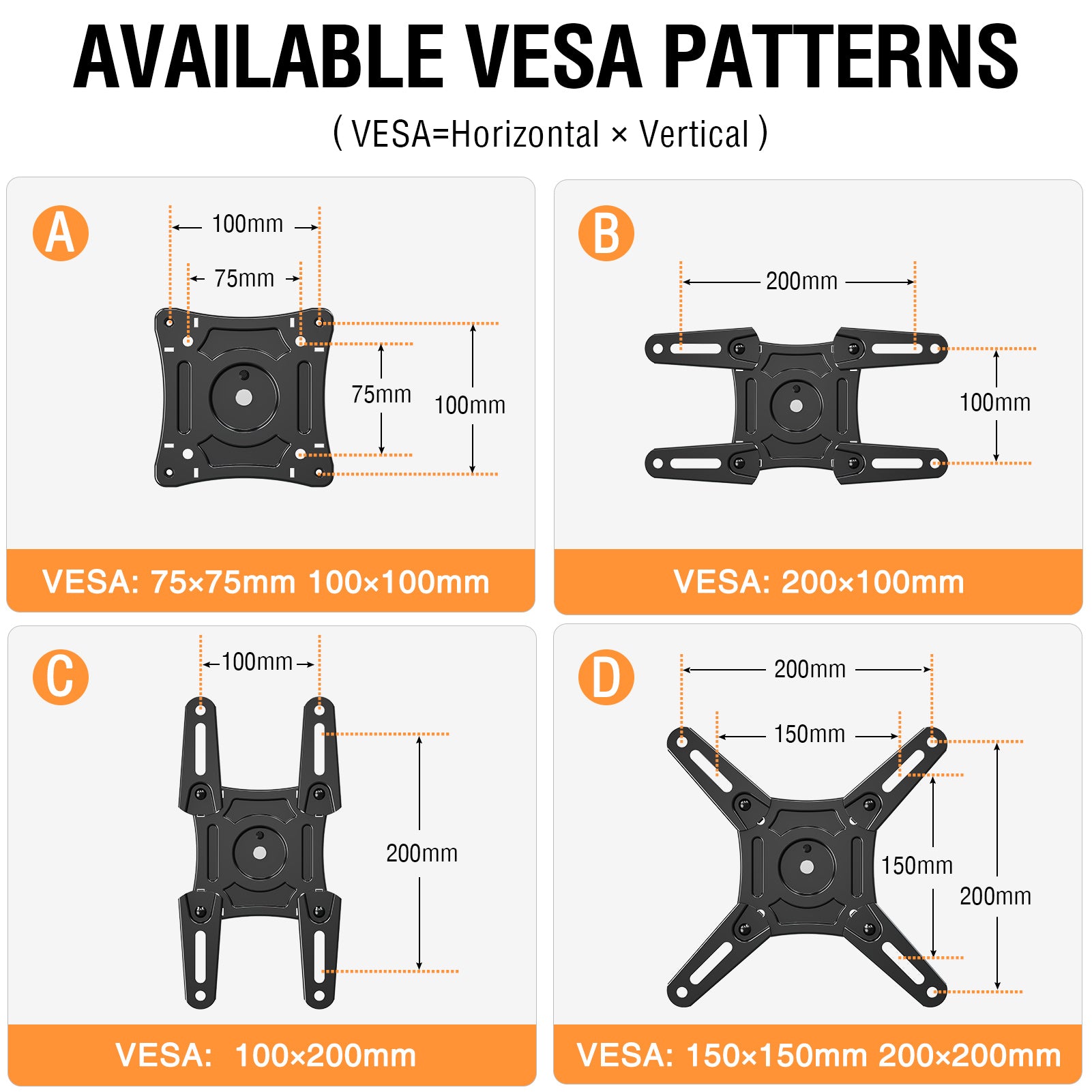 - Universal Monitor Wall Mount - Our monitor mount fits monitors sizes 14-42 inch with VESA patterns from 75x75mm to 200x200mm. This wall monitor mount can keep your monitor to eye level and mount your monitor at an ergonomic sitting position to reduce eyes train and neck pain while saving up much space on your desktop.