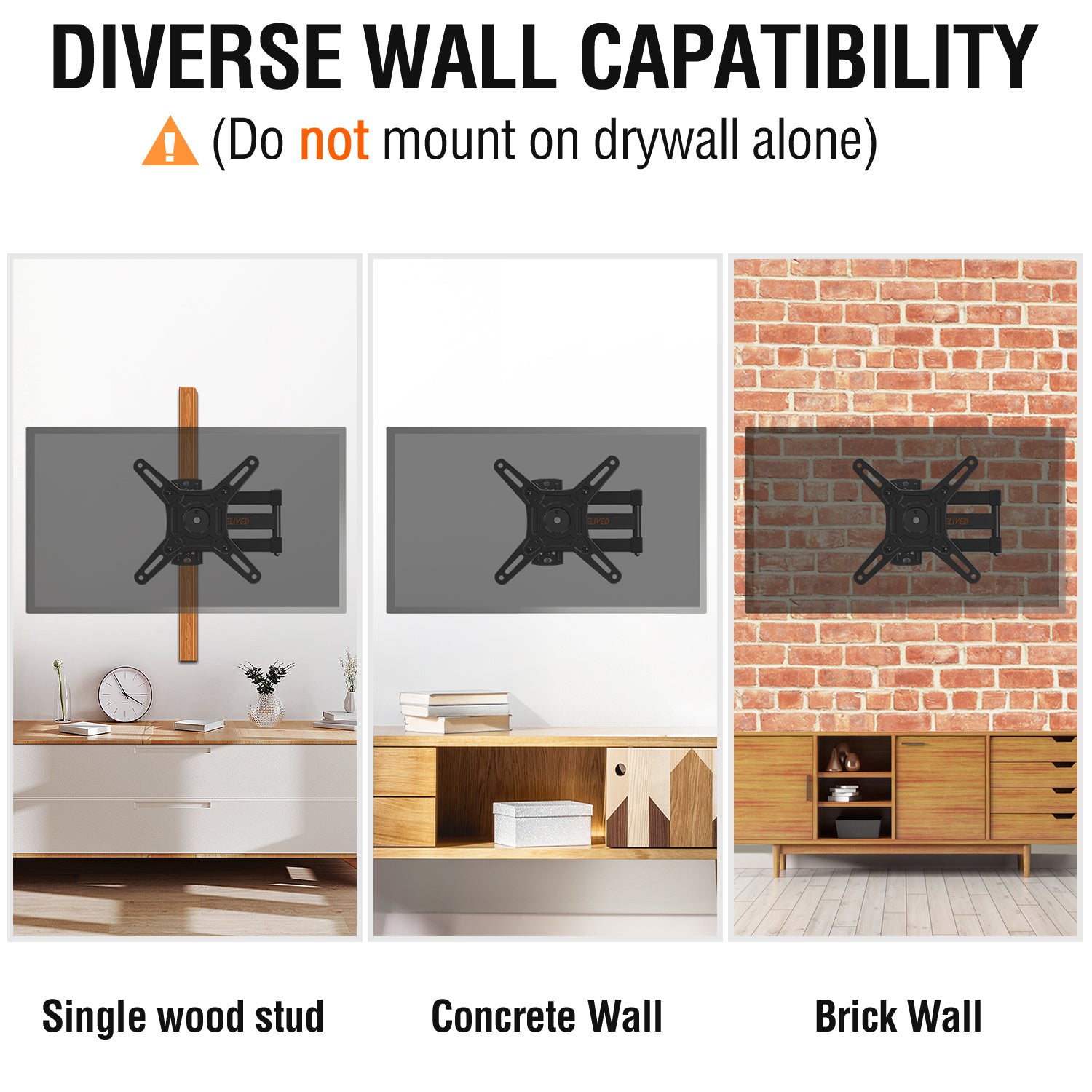 - TV Wall Mount Applicability - This TV mount fits most 14-42 inch TVs and monitors, with 33 lbs. Max loading and vesa sizes from 75x75mm to 200x200mm. This wall mount TV bracket is designed for single wood stud or concrete/brick walls.